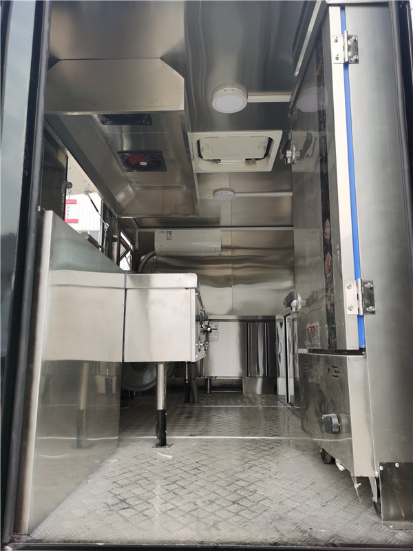 拖掛餐飲車(chē)集廚房休息室與一體。內部配備蒸飯柜,柴油灶,不銹鋼水箱,水池子。不銹鋼案板,儲物柜等基礎**。